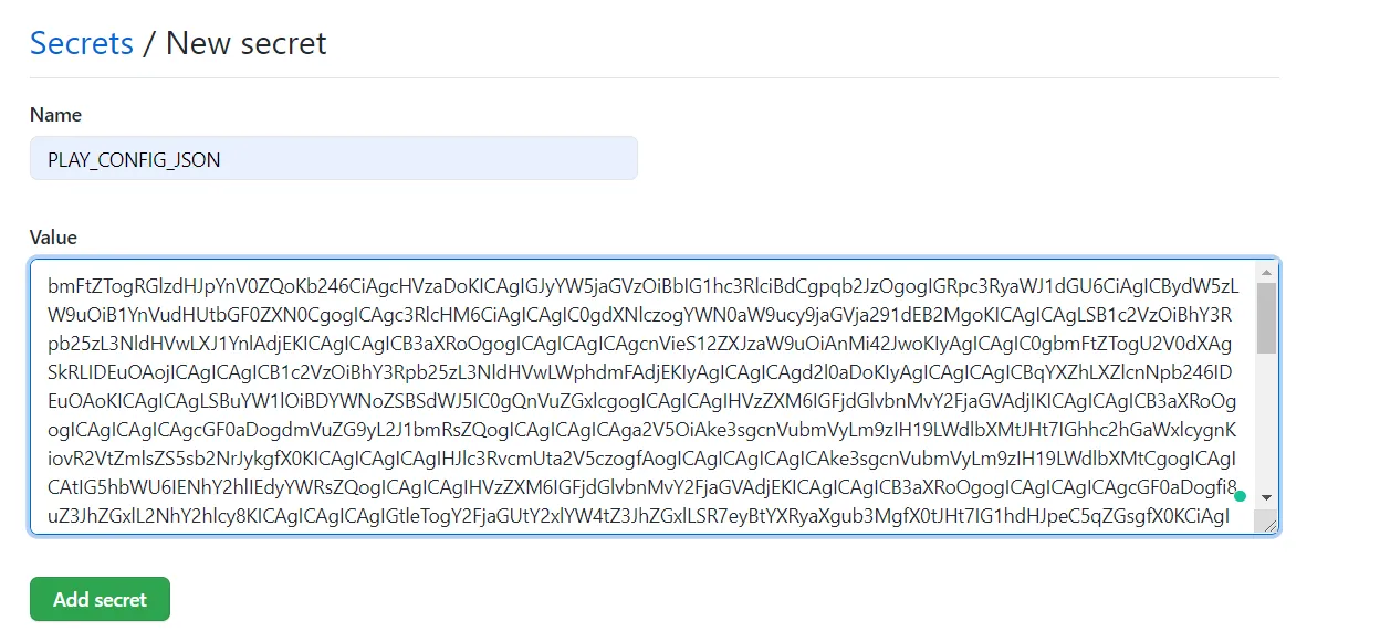 This will encode Google play configuration file and see generated .b64 file. Now copy the content of the file and add a secret in GitHub Actions 👇: