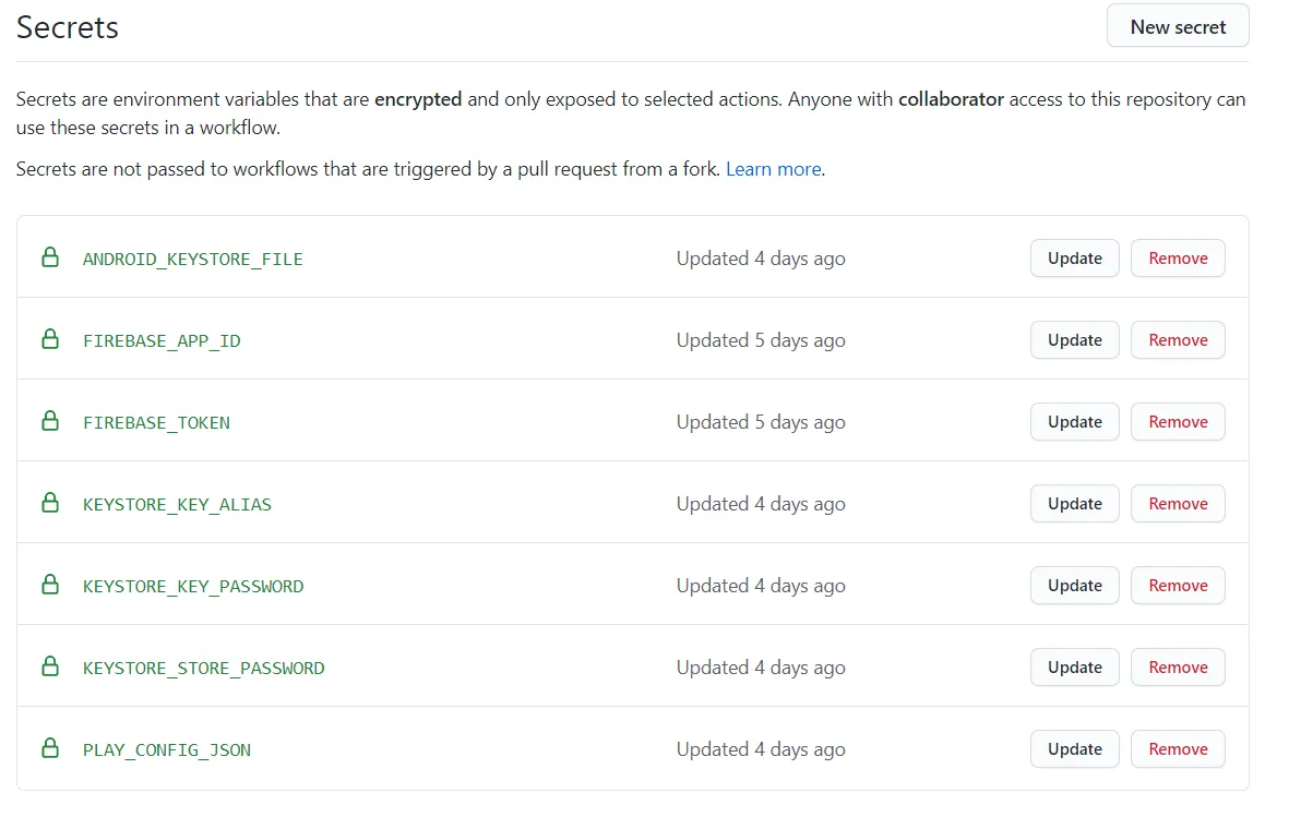 Do the same procedure for the Keystore file and add Keystore file’s Base64 encoded content and other configurations as secret. Now secrets of Action would look like 👇: