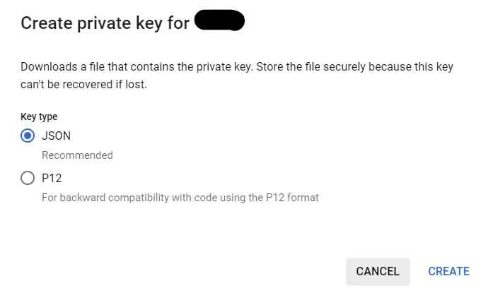 - Then you’ll see list of service accounts. Click Action menu of service account which you just created → Create Key → Select ‘Key Type’ as “JSON” → Click “CREATE”.