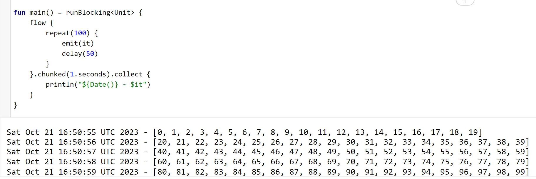 It creates a chunk (sublist) of items based on the chunk size provided. Similarly, we have to collect the Flow items in chunks. But in our use case, we want to receive the chunks based on the time intervals, not based on the size.