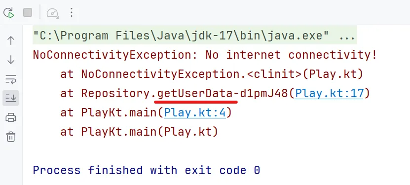 Wrong stack trace for the wrong method! 😏 This was expected because object creates a singleton instance of class lazily when it’s accessed for the first time. In the above sample, we called the method getUserData() before getAppData() and inside getUserData() method when throw NoConnectivityException was executed, the instance was created and kept forever. Next time when getAppData() throws the Exception, it’s throwing an Exception which was earlier created by getUserData() method 🤷🏻♂️.