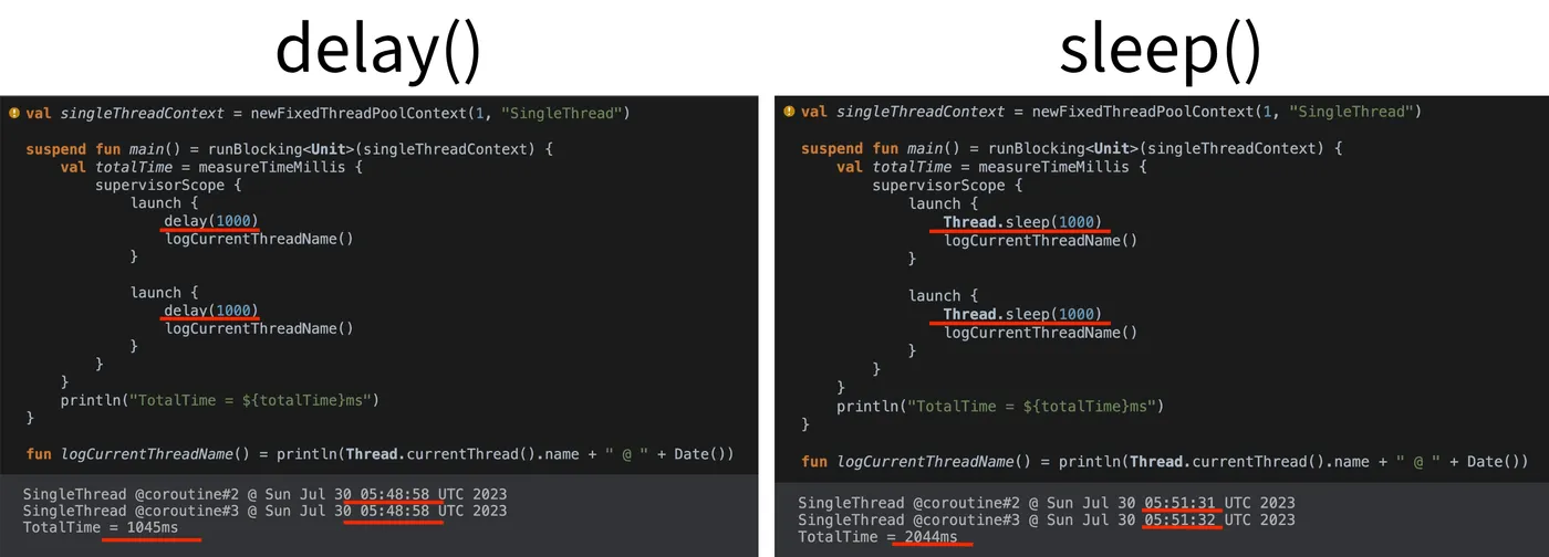 delay(), both coroutines were launched at same-second instant (05:48:58). - With