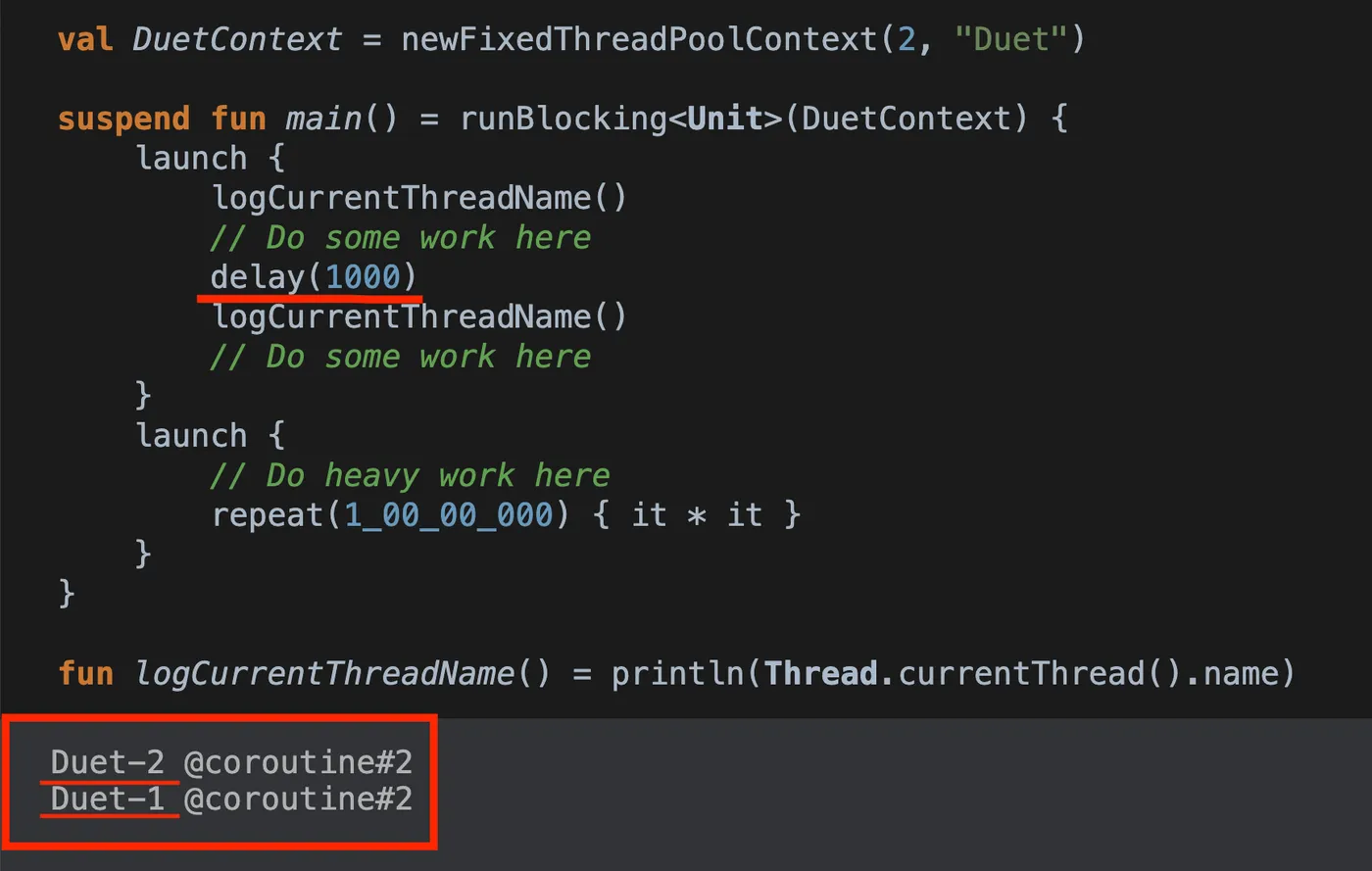 There is a Thread pool context of a Maximum of 2 threads. The first coroutine is launched, it does some work there, and then it adds a delay() of one second and after that delay, it does some work. Concurrent with the first coroutine, a second coroutine is launched which performs heavy tasks in such a way that a Thread will be spending most of its time executing that task.