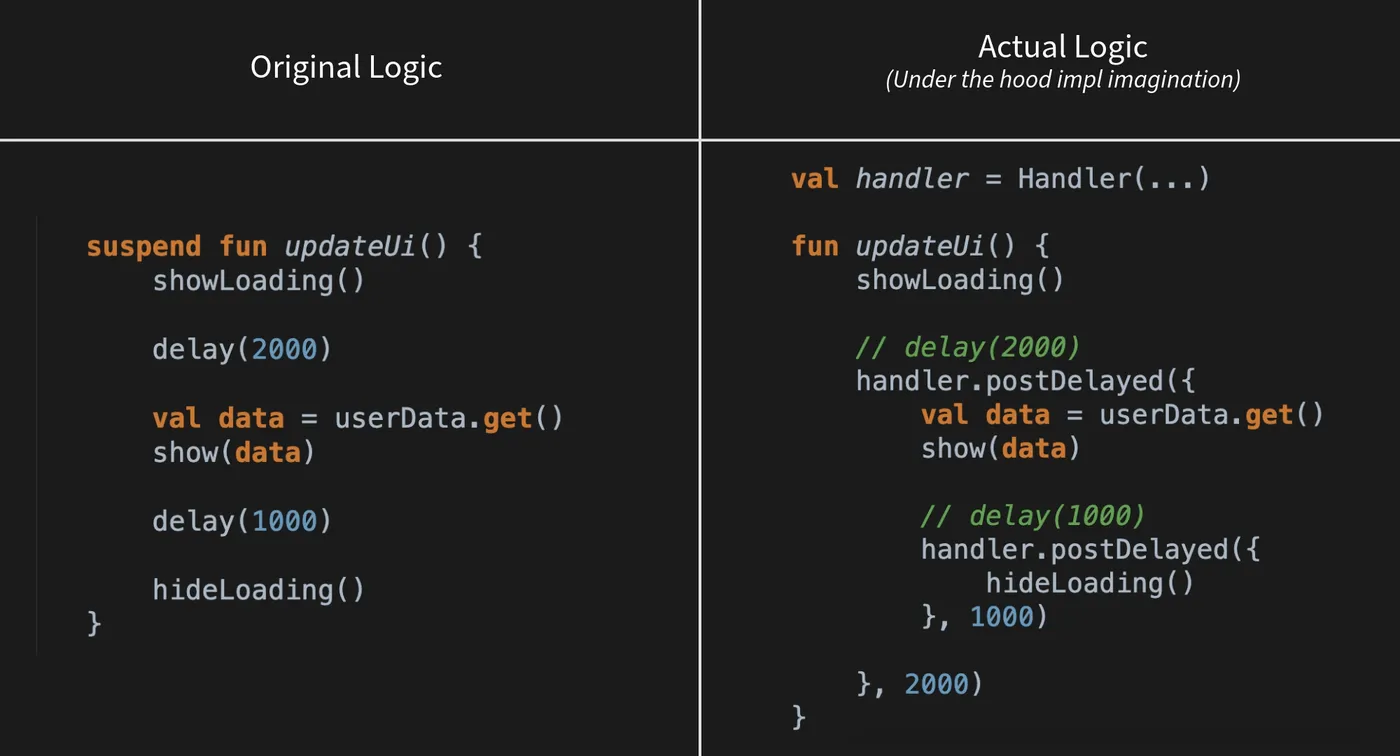 Straightforward š. It just posts continuation runnable on the Handler with postDelayed() with delay. Thatās the reason calling a delay() doesnāt block the thread.