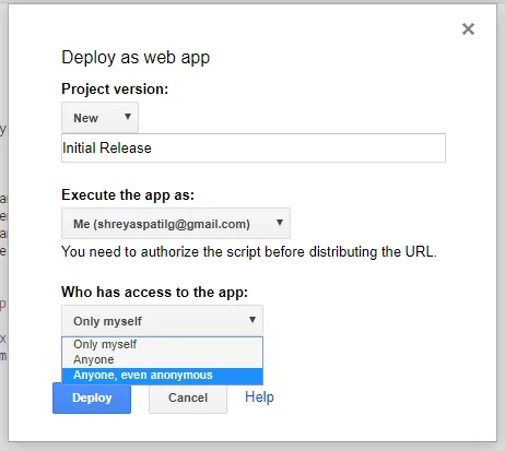 - You’ll see a window like this, Just ensure that select ‘Execute the app’ as ‘Me’ and ‘Who has access to the app’ as ‘Anyone, even anonymous’.